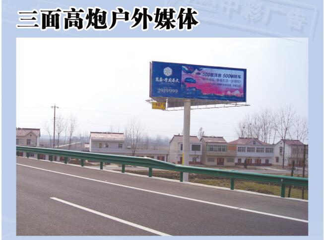 规格:18米✖️6米✖️3块,高精度喷绘,本广告媒体位于六叶高速与六安到金寨交叉口、六阜高速与六安到金寨交叉口是重要的高速交通纽带,来往人员密集,视觉效果极佳